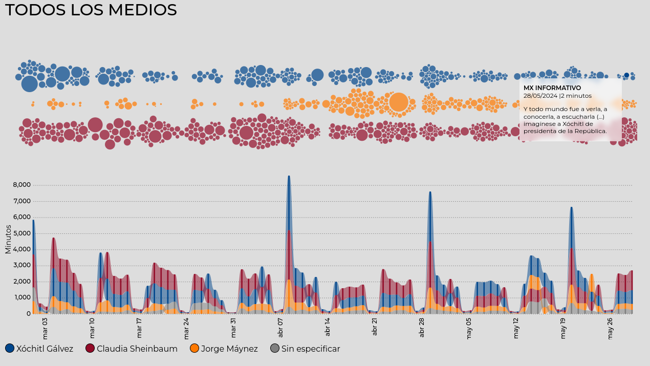 En esta herramienta se visualiza el tiempo que han destinado diariamente los medios de radio y TV a la difusión sobre cada candidatx, así como los juicios de valor, estereotipos y enfoques que han emitido a través del proceso de campañas electorales.